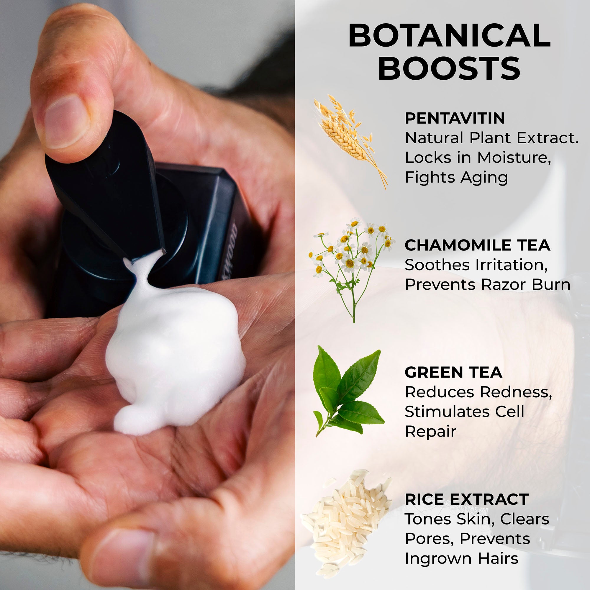 We designed this foam to be just thick enough to provide a smooth, comfortable shave, propping up your beard and lubricating your skin so your razor has a nice, easy time as it glides along doing its thing. We also added natural Botanical Boosts that help to soothe irritated skin. Chamomile and Green Tea work to calm inflammation, reduce redness, and prevent razor burn. Meanwhile, Pentavitin helps to hydrate your skin, locking in moisture and forming a protective barrier while also helping to reduce wrinkles and slow signs of aging.