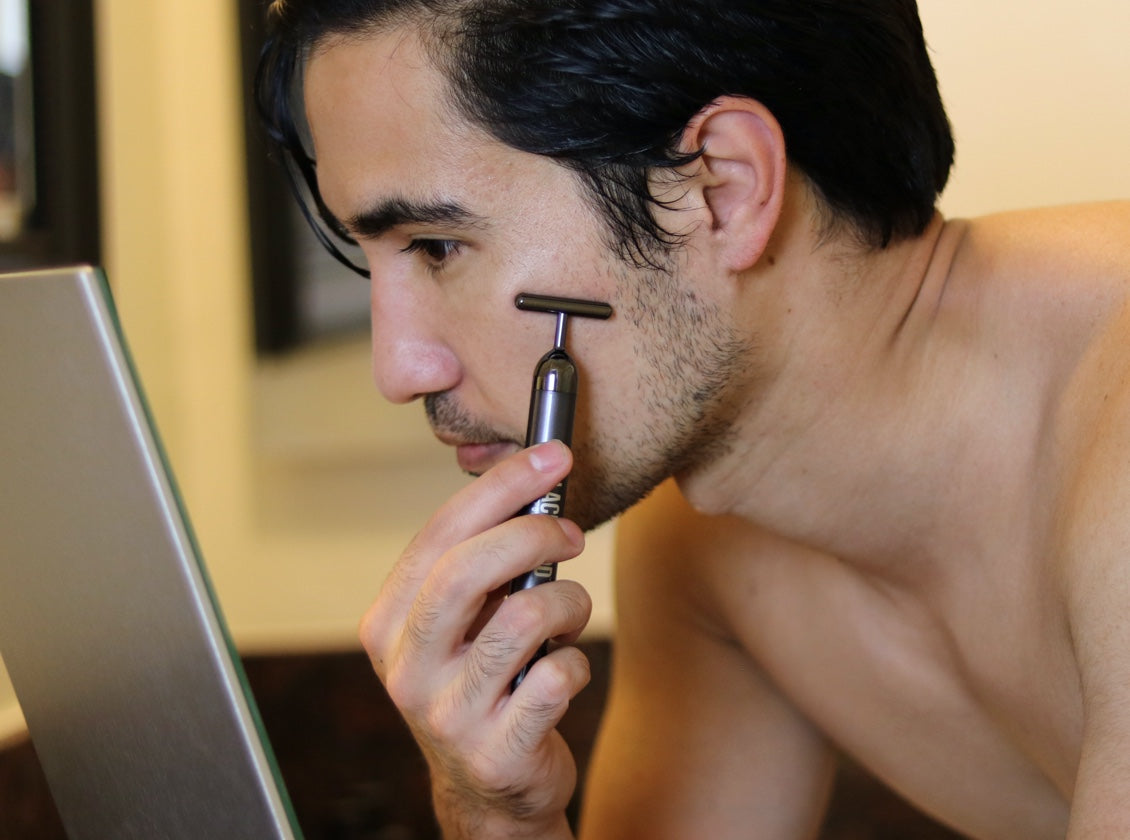 To use, simply turn the base clockwise. Once vibration starts, rub the T bar gently in a downward motion along face. Picking up & starting again at a high point, then moving down in one smooth motion is the preferred method, but just rubbing back & forth on face will also work.